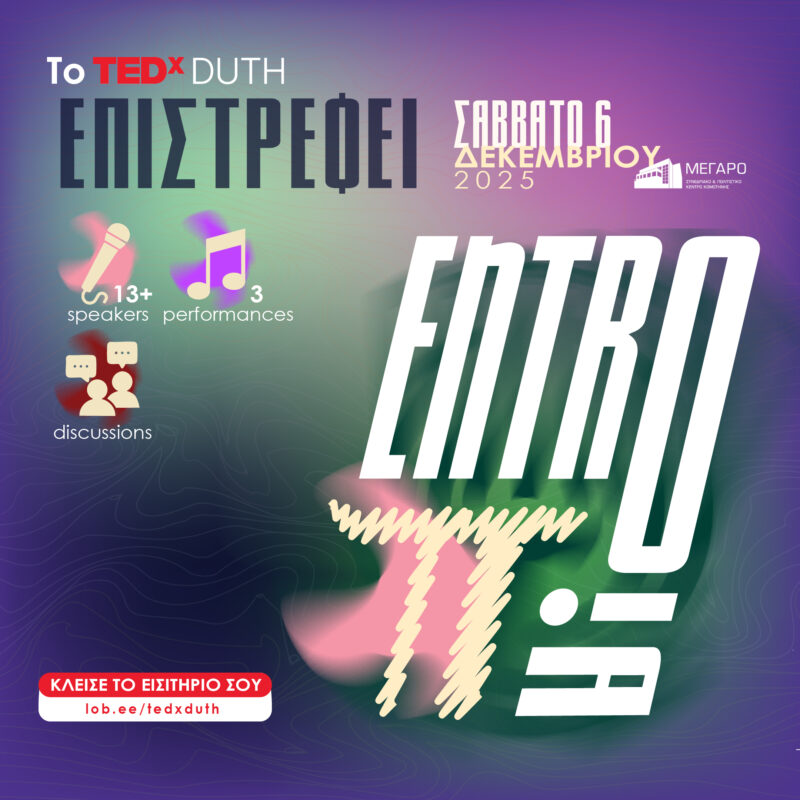 Διοργάνωση  του TEDxDUTH στο Μέγαρο Μουσικής Κομοτηνής στις 6 Δεκεμβρίου με θέμα την “entroπia”