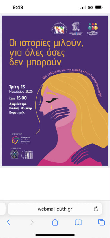ΟΙ ΙΣΤΟΡΙΕΣ ΜΙΛΟΥΝ, ΓΙΑ ΟΛΕΣ ΟΣΕΣ ΔΕΝ ΜΠΟΡΟΥΝ Μια εκδήλωση για την έμφυλη και ενδοοικογενειακή βία(Αμφιθέατρο Παλιάς Νομικής Κομοτηνής)